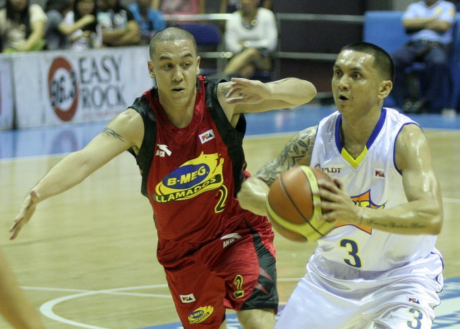 Jayson Castro (left) finds daylight against the defense of Marc Pingris. KC Cruz