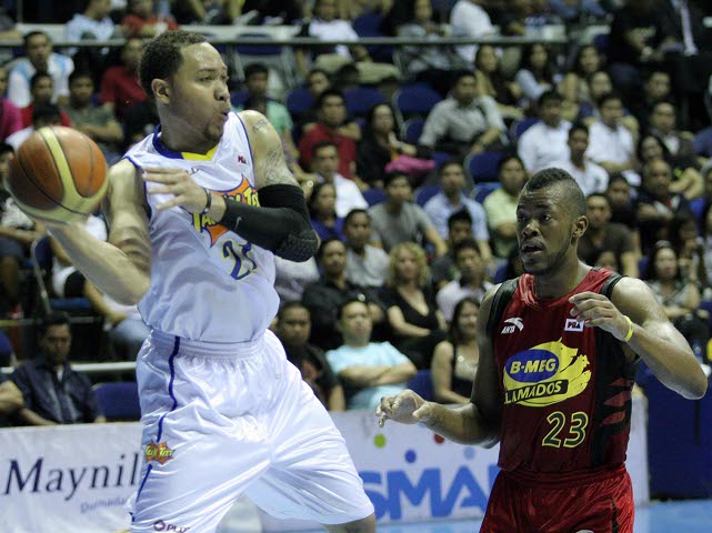 Kelly Williams (left) corrals the loose ball before B-MEG import Marcus Blakely can get to it. KC Cruz