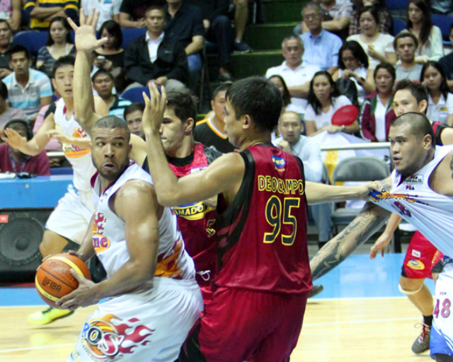 Jamelle Cornley (white) top-scored for Rain or Shine, despite scoring just 14 markers. Nuki Sabio