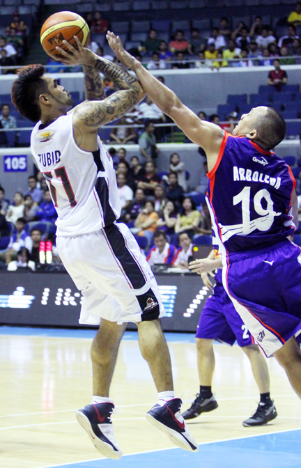 "Main man" Ronald Tubid (left) launches a shot over Air21's Wynne Arboleda. Nuki Sabio