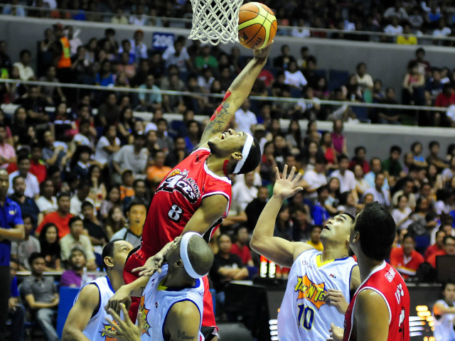 Calvin Abueva rises above the Talk n' Text defense. Photo by KC Cruz