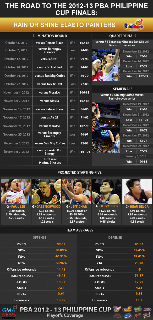Take a look back at Rain or Shine's road to the 2012-13 Philippine Cup Finals with GMA News Online Sports' infographic. Examine the wins and losses of the Elasto Painters, and the path they took through the playoffs. .jpg)