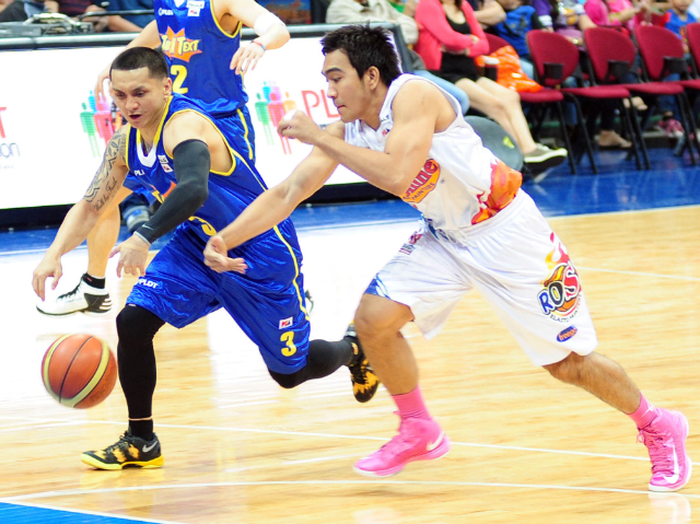 Jimmy Alapag (L) eludes the swipe attempt by Ryan Arana. KC Cruz