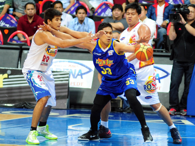 Ranidel De Ocampo (C) fights for the loose ball against Rain or Shine bruisers Jervy Cruz (L) and Beau Belga. KC Cruz