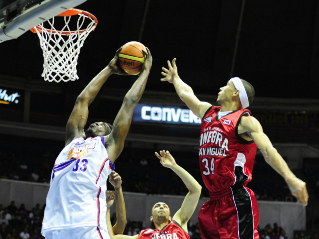 Air 21's Michael Dunigan skies high against Ginebra's Chris Ellis. Photo by KC Cruz