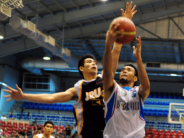 Jeckster Apinan (L) and the rest of Air21 JRU upset Big Chill in the quarterfinals. KC Cruz