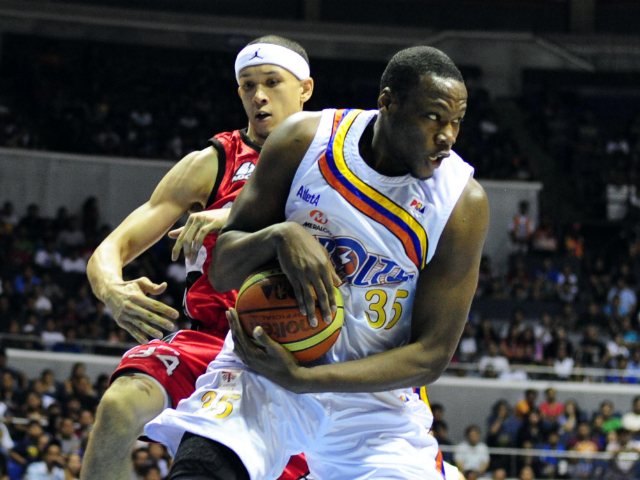 Chris Ellis (left) tries for a steal against Meralco Bolts import Eric Dawson. KC Cruz