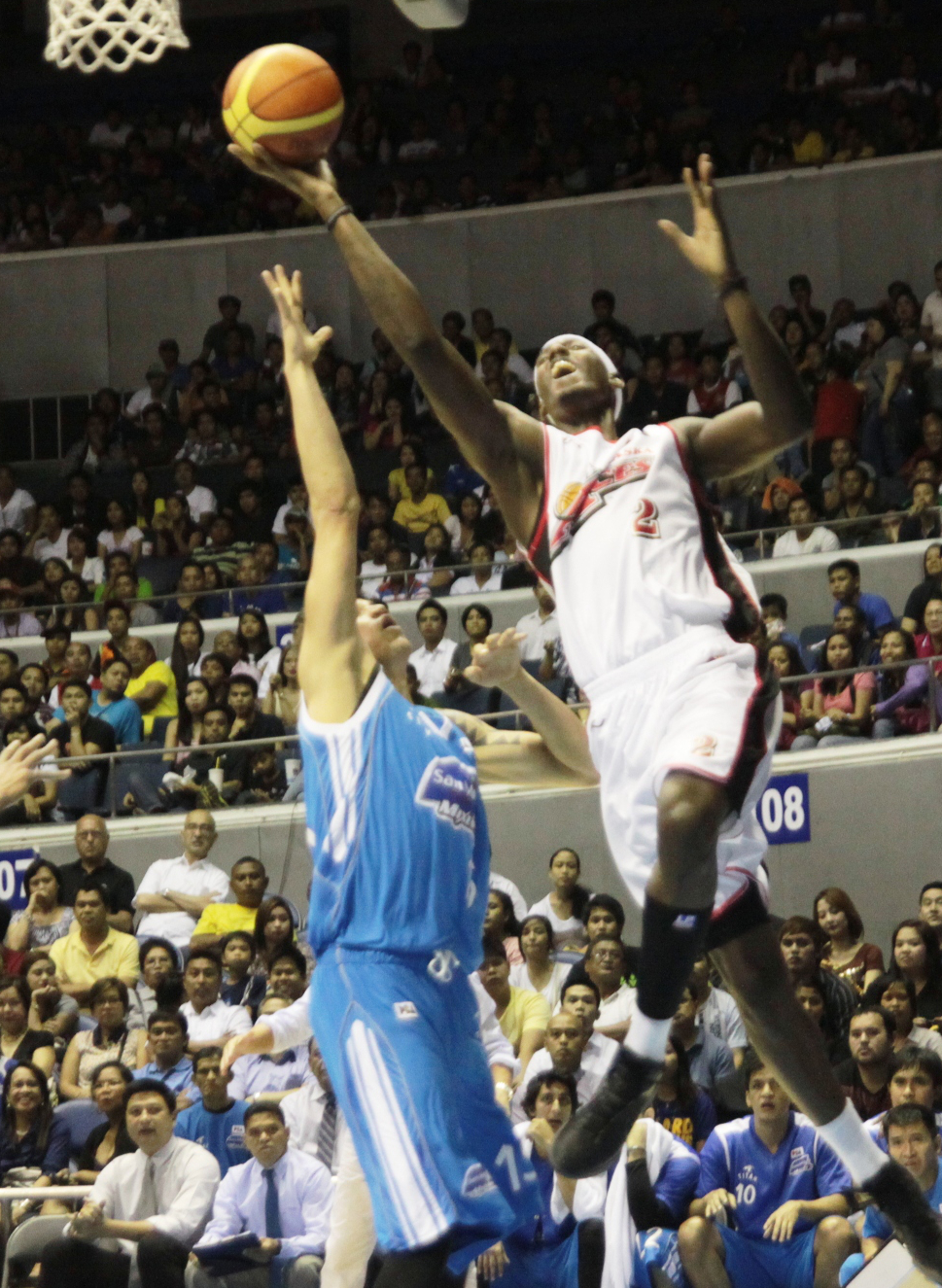 San Mig Coffee Mixer Marc Pingris stood toe-to-toe with Meralco Bolts import Eric Dawson in the fourth quarter of their win-or-go-home game, during the two teams' 2013 PBA Commissioner's Cup quarterfinals series. Dawson, the most potent scorer in the Commissioner’s Cup, drove to his right and Pingris met him there. The American giant crossed over to his left but Pingris stayed right on his face. Finally, Dawson stepped back and launched a jumper. Pingris gathered, leapt forward, and attempted the impossible. He tried to block a Dawson fadeaway J. Pingris failed. Dawson’s shot flew about four inches above Pingris’s outstretched fingertips. But he bothered Dawson enough to make him miss the shot.