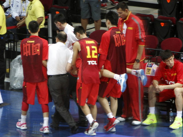 Chinese point guard Liu Xiaoyu suffered a hard fall early in the game and had to be carried off by his teammates. KC Cruz
