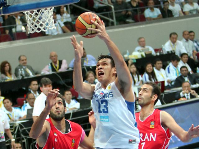 June Mar Fajardo (C) gets an attempt off against the Iran big men. Nuki Sabio