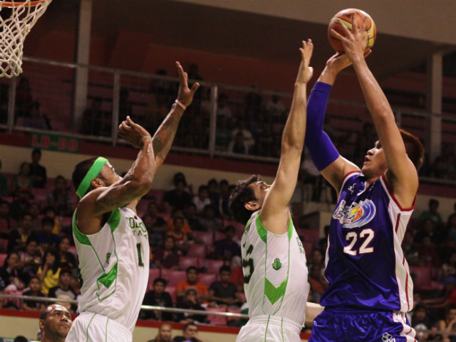 Battle of giants as June Mar Fajardo (R) draws a double-team from former teammate Jay Washington (L) and Yousef Taha. Jeff Venancio