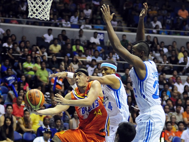 James Yap (C) pulls off an acrobatic shot amidst the Meralco defense. KC Cruz