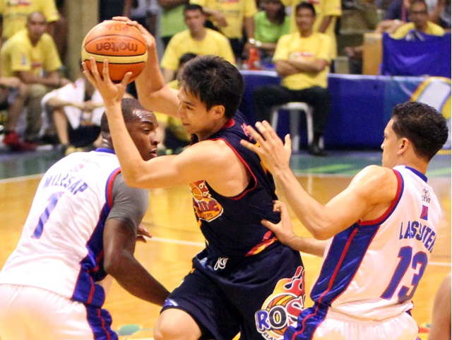 Rain or Shine's Chris Tiu (C) tries to squeak past Petron's Marcio Lassiter (R) and Elijah Millsap. Nuki Sabio