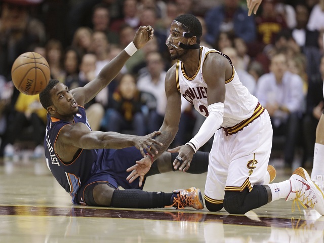 Cleveland Cavaliers' Kyrie Irving, right, passes the ball past Charlotte Bobcats' Michael Kidd-Gilchrist during the first quarter. Tony Dejak / AP Photo