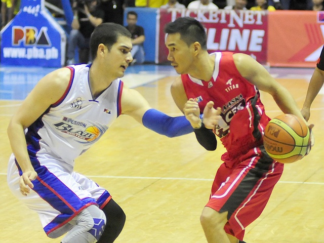Cyrus Baguio of Alaska tests the defense of the taller Jason Deutchman. KC Cruz