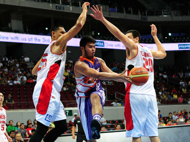 Rookie Eric Camson (C) opts to pass out of a double-team by Ginebra's two big men, Japeth Aguilar (L) and Greg Slaughter. KC Cruz