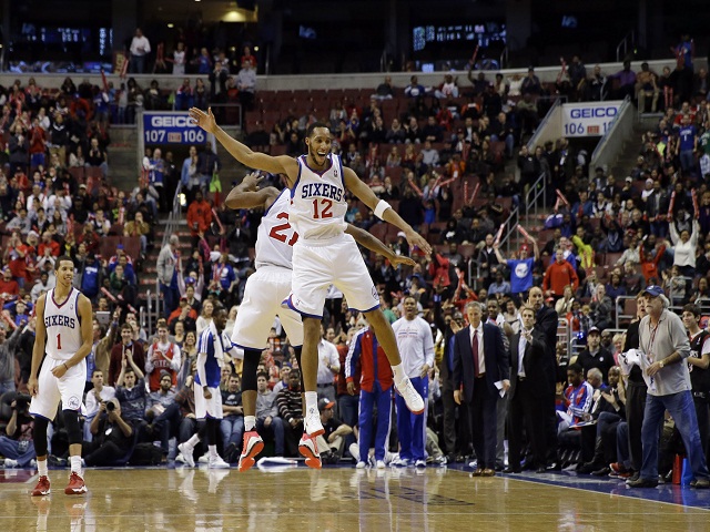 Philadelphia 76ers' Evan Turner (12) and Thaddeus Young (21) celebrate after a basket by Young during overtime. Matt Slocum / AP Photo