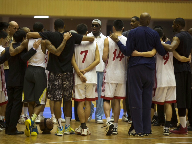 Dennis Rodman and his group of former NBA players and North Koreans. Kim Kwang Hyon / AP Photo