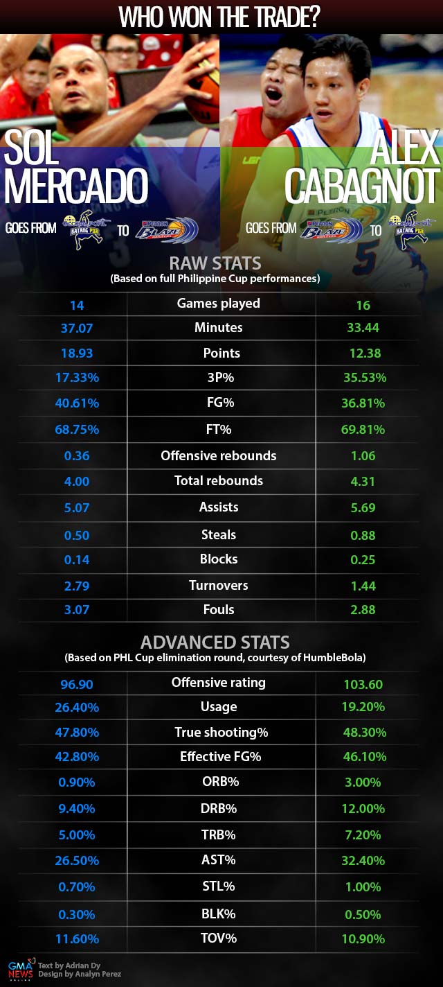 Who got the better of the trade - the Petron Blaze Boosters / San Miguel Beermen adding Sol Mercado, or the GlobalPort Batang Pier acquiring Alex Cabagnot? Check out their numbers in our infographic and then let us know in the poll.