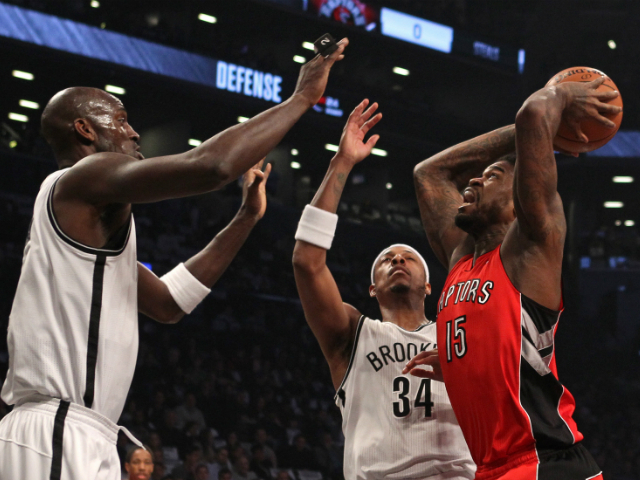 Toronto Raptors forward Amir Johnson (15) attacks Brooklyn Nets center Kevin Garnett (2) and forward Paul Pierce (34). Adam Hunger-USA TODAY Sports / Reuters