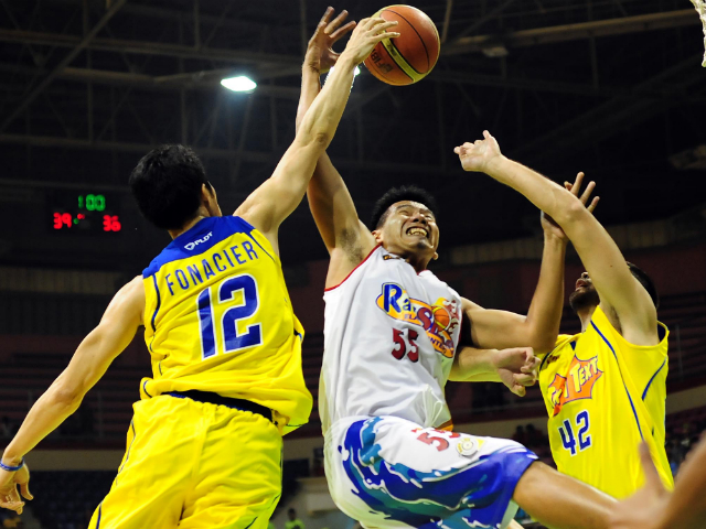 Larry Rodriguez (C) gets blocked by Larry Fonacier, while Danny Seigle applies some extra pressure. KC Cruz