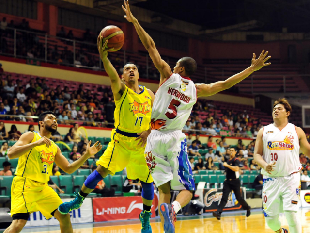 TNT guard Jayson Castro attacks Rain or Shine defender Gabe Norwood. KC Cruz