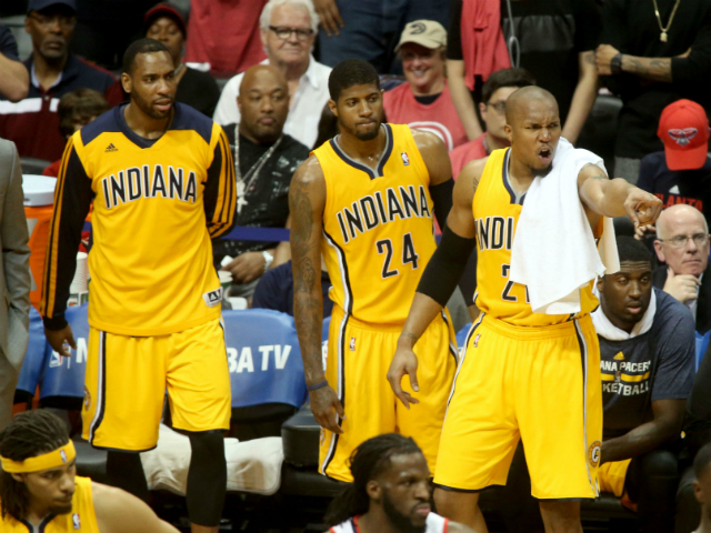 Indiana Pacers Paul George (C) and David West (R) were key in forcing a game seven. Jason Getz-USA TODAY Sports / Reuters