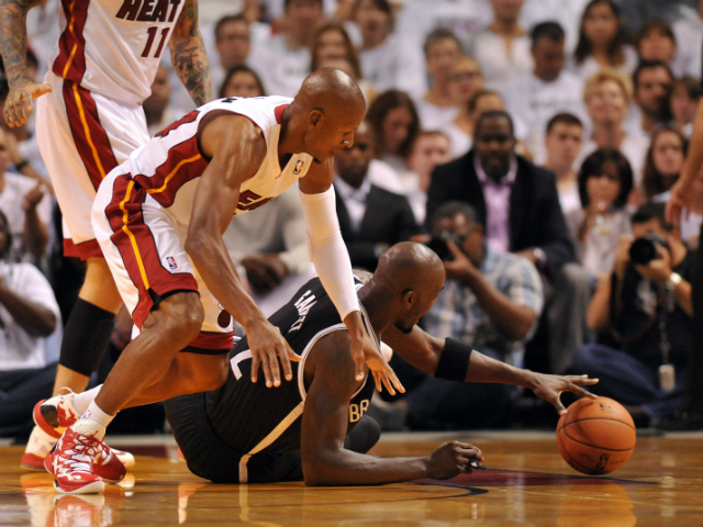 Formerly teammates on the Boston Celtics, Miami Heat guard Ray Allen (34) and Brooklyn Nets center Kevin Garnett (2) chase a loose ball. Steve Mitchell-USA TODAY Sports