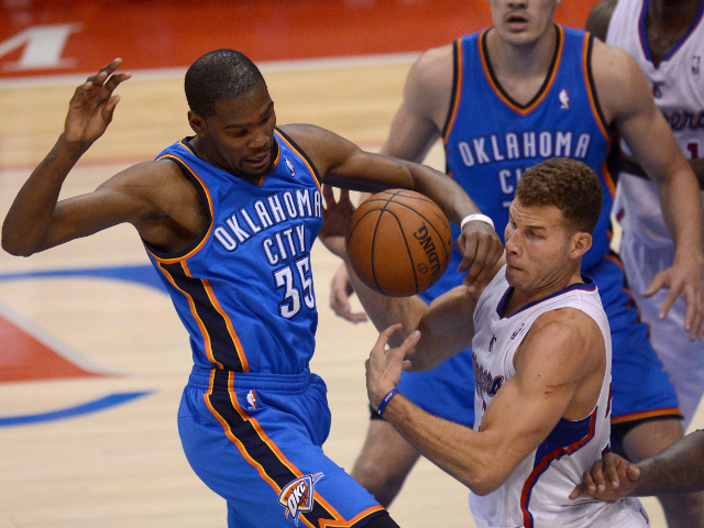 Los Angeles Clippers forward Blake Griffin (32) and Oklahoma City Thunder forward Kevin Durant (35) battle for a loose ball. Jayne Kamin-Oncea-USA TODAY Sports / Reuters