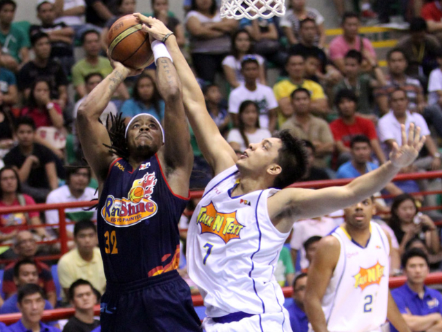 New TNT import and former NBA player Rodney Carney (R) attacks Ryan Arana’s defense while Arizona Reid looks on. Nuki Sabio