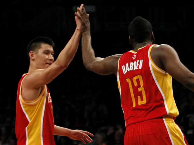 Houston Rockets point guard Jeremy Lin (L) and guard James Harden. Adam Hunger / Reuters