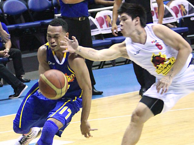 Carlo Lastimosa (R) tries to stop Jayson Castro’s drive. Nuki Sabio