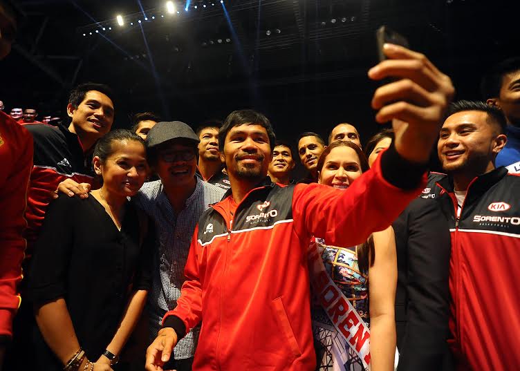 Kia coach Manny Pacquiao takes a selfie with his players before the game. KC Cruz