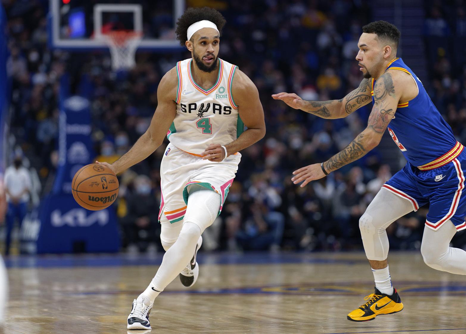 Derrick White scored 25 points, including a 3-pointer and three free throws in the game's final 1:44, as the visiting San Antonio Spurs held off the Golden State Warriors 112-107 on Saturday in San Francisco to win their season-best fourth straight game.