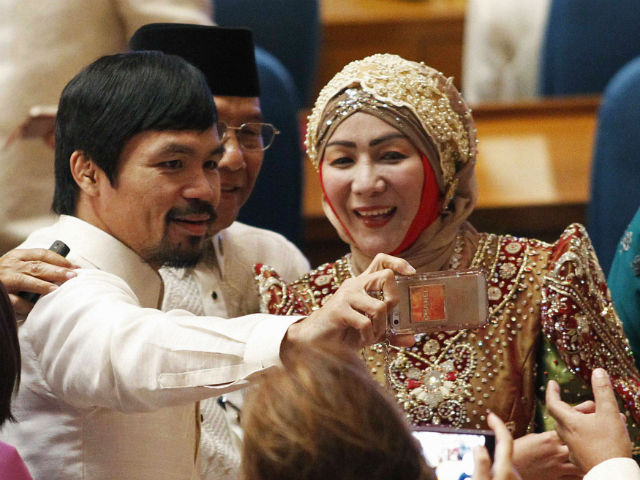 Manny Pacquiao takes a selfie with fellow congressmen before the start of the joint session of the 16th Congress. Reuters