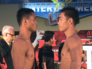 Rey "Boom Boom" Bautista, left, faces off with Indonesian opponent Marangin Marbun during their official weigh-in Thursday in Cebu City. Dennis Principe