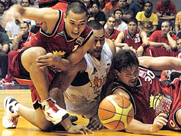Ginebra's Celino Cruz, left, and Erik Menk, right, gang up on Talk 'N Text's Ali Peek in a battle for ball possession during the PBA Philippine Cup at the Araneta Coliseum. GMANews.TV