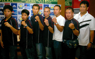 Boxers Mitchel Martinez, Annie Albania, Joan Tipon, Harry Tañamor, and Charlie Suarez with coachers Boy Catolico (womenâs team) and Pat Gaspi (menâs team) during a recent PSA Forum. Mike Taboy