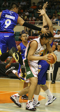 Marlou Aquino of Sta. Lucia, center, barrels his way past Ronjay Buenafe, left, and JR Quinahan of Burger King during their PBA Philippine Cup game at the Astrodome Friday. GMANews.TV