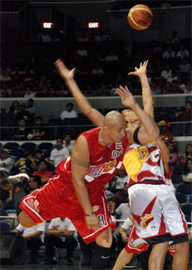 Coca-Cola's Asi Taulava, left, collides with San Miguel's Samigue Eman during their PBA Philippine Cup game Wednesday at the Araneta Coliseum. GMANews.TV
