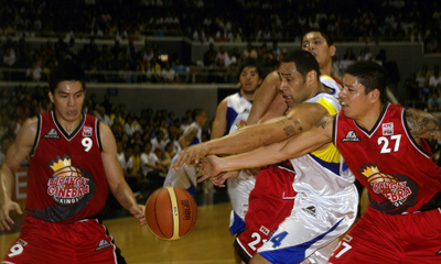 Barangay Ginebraâs JC Intal, left, helps out teammate Willy Wilson, right, in a looseball struggle against Talk âN Textâs Ali Peek in Game 5 of their PBA Philippine Cup quarterfinal series Sunday at the Big Dome. Mike Taboy