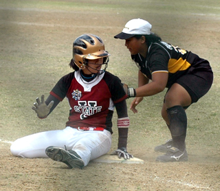 Anna Carissa Paghubasan of UST, right, tries to tag out Krein Sanggalang of UP at the 3rd base during the UAAP softball tournament Wednesday at UST baseball field in Manila. Gil Ancheta