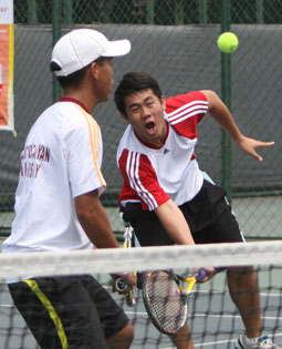 Region 10âs Bobby Chio, right, goes for a shot as partner Joy Salvo looks ob during their match with Region 7 for the menâs doubles gold medal Friday at the Rizal Memorial Tennis Center. GMANews.TV