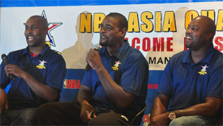 Members of the NBA Legends (from left) Gary Payton, Chris Webber, Glenn Rice answer questions from reporters during Tuesday's press launch for the NBA Asia Challenge 2010 in Makati City. The NBA Asia Challenge will be played Aug. 27 at the Big Dome. GMANews.TV