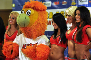 The Miami Heat dancers and mascot Burnie (center) pose for photographers during Tuesday's press launch for the NBA Asia Challenge 2010 in Makati City. The NBA Asia Challenge will be played Aug. 27 at the Big Dome. GMANews.TV