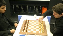 Wesley So (left) waits for the fist move of Grandmaster Vlad Tkachiev of France (right) in their 10th round match in the Corus Grop B chess championship. National Chess Federation of the Philippines