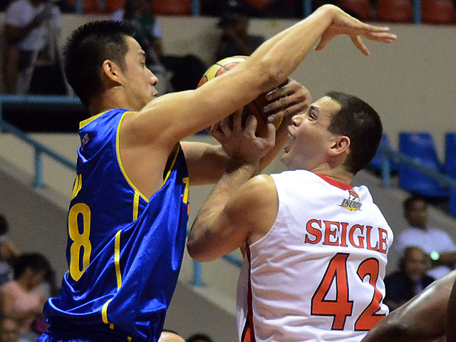 Gilbert Lao (left) of Talk 'N Text fouls Barako Bull's Danny Seigle, as Seigle forces up a shot during their game in the 37th PBA Commissioner's Cup Semifinal match at the Ynares Center in Antipolo City on Tuesday.KC Cruz