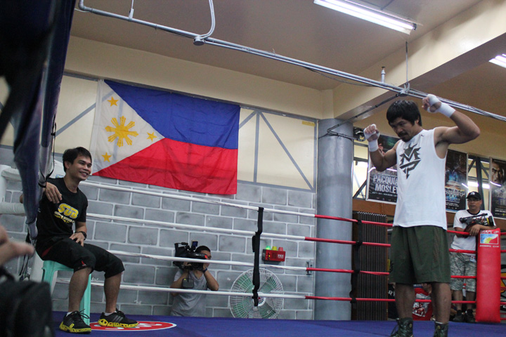 “Alex became a well known conditioning coach because of Manny. I don’t understand why he chose to help Chavez prepare instead of Manny,” one team member said. Local trainer Marvin Somodio has been tapped to temporarily replace Ariza in stretching out Pacquiao and Khan before they hit the mitts. “Alex has always been kind to me and he gave me pointers on how to stretch Manny,” said the diminutive Somodio. “I was a little nervous when I first stepped into the ring to help Manny prepare but because the mood was light and jolly, I quickly became at ease.” The people around the ring were all smiles when they saw Somodio take Ariza’s role. “What happened to Alex? Why did he become smaller?” teased one. “It’s Manny Pacquiao and Mini Pacquiao,” shouted another. The gym broke into laughter. And with that, Somodio continued to work with the champ and limber him up for another ten rounds of mitts with Freddie Roach. Roach has long wanted Somodio to head to the United States and be his assistant trainer at the Wild Card Gym. The two have formed a bond over the past three years and there is mutual trust and respect between the two. After the training session, Pacquiao talked to Mike Koncz and asked him to help Somodio in procuring a US Visa so he can visit Roach’s gym. There might be other reasons for Ariza’s departure that are beneath the surface. There may be underlying reasons that only Ariza knows. But as a casual observer, it seems all is well in Pacquiao’s camp and that Ariza will be working with Pacquiao again when the reigning WBO welterweight champion starts his training at the Wild Card Gym in Los Angeles by the second week of May.