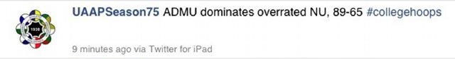 Both the original tweet and the subsequent "explanation" were later deleted. In its apology, the UAAP Online Media Bureau explained that an intern from the University of the East was the one who came up with the tweet, but that too did not sit well with some Twitter users, who saw it was an attempt to shift blame.“@UAAPSeason75: NU played a tough fight today. Ateneo just made its way for a big win. Just to explain the 'overrated' adjective. #UAAP75” — Professional Heckler (@HecklerForever) July 22, 2012