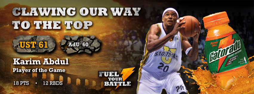 Karim Abdul notched a double-double with 18 points and 12 rebounds, and UST kept their heads together as they gashed the Adamson Soaring Falcons in the dying minutes of the fourth quarter, 61-60, at the Araneta Coliseum. Coach Pido Jarencio credited Abdul for playing smart despite the rugged nature of the game, after both Eric Camson and Rodney Brondial kept on doubling him in the paint. “Si Karim walang bola eh. Kung idodouble si Karim, alam na rin naman namin yung rotation ng bola. Sinabi ko kasi sa kanya, Karim wala na tayong magagawa, hindi ka na naming pwedeng ilabas. Lagi ko siyang tinatanong, nireremind ko sIya last five minutes, at sabi niya, “Coach, I can play”. UST went on a 7-0 run in the last two minutes, culminated with an inside shot off Abdul, his staple move. Adamson fumbled on their last possession and ultimately gave up the win. The Falcons opened the final period with a 7-2 run, but failed to convert in the last few minutes as top scorer Camson returned to the game only in their last possession.